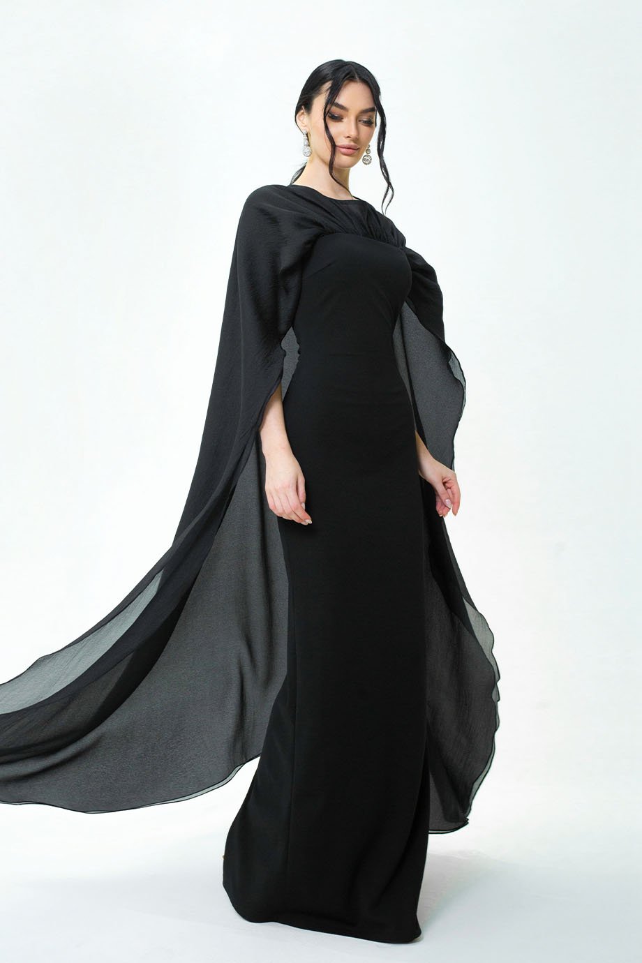 Classic fitted dress in light-neo crepe fabric with attached tissue organza cape