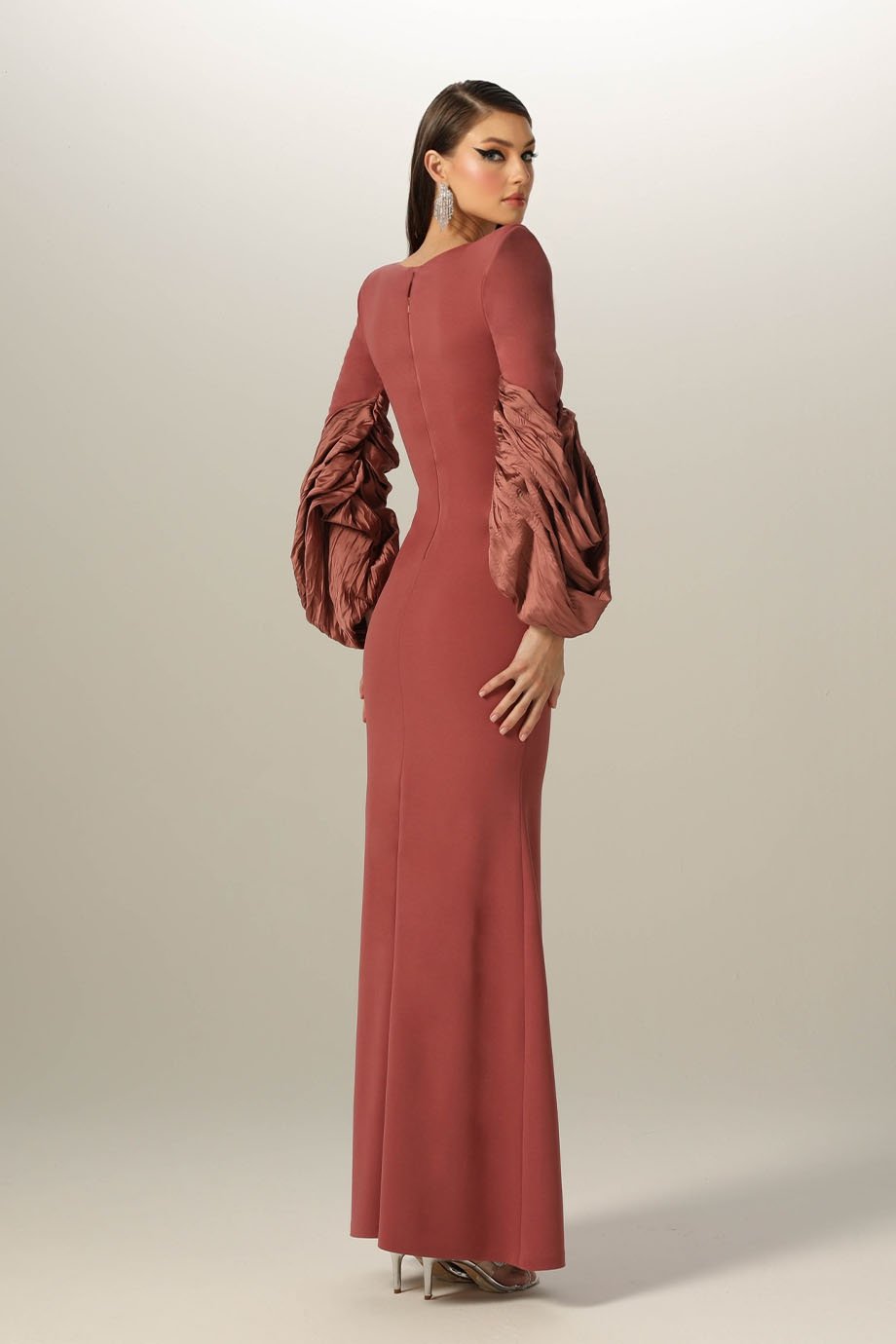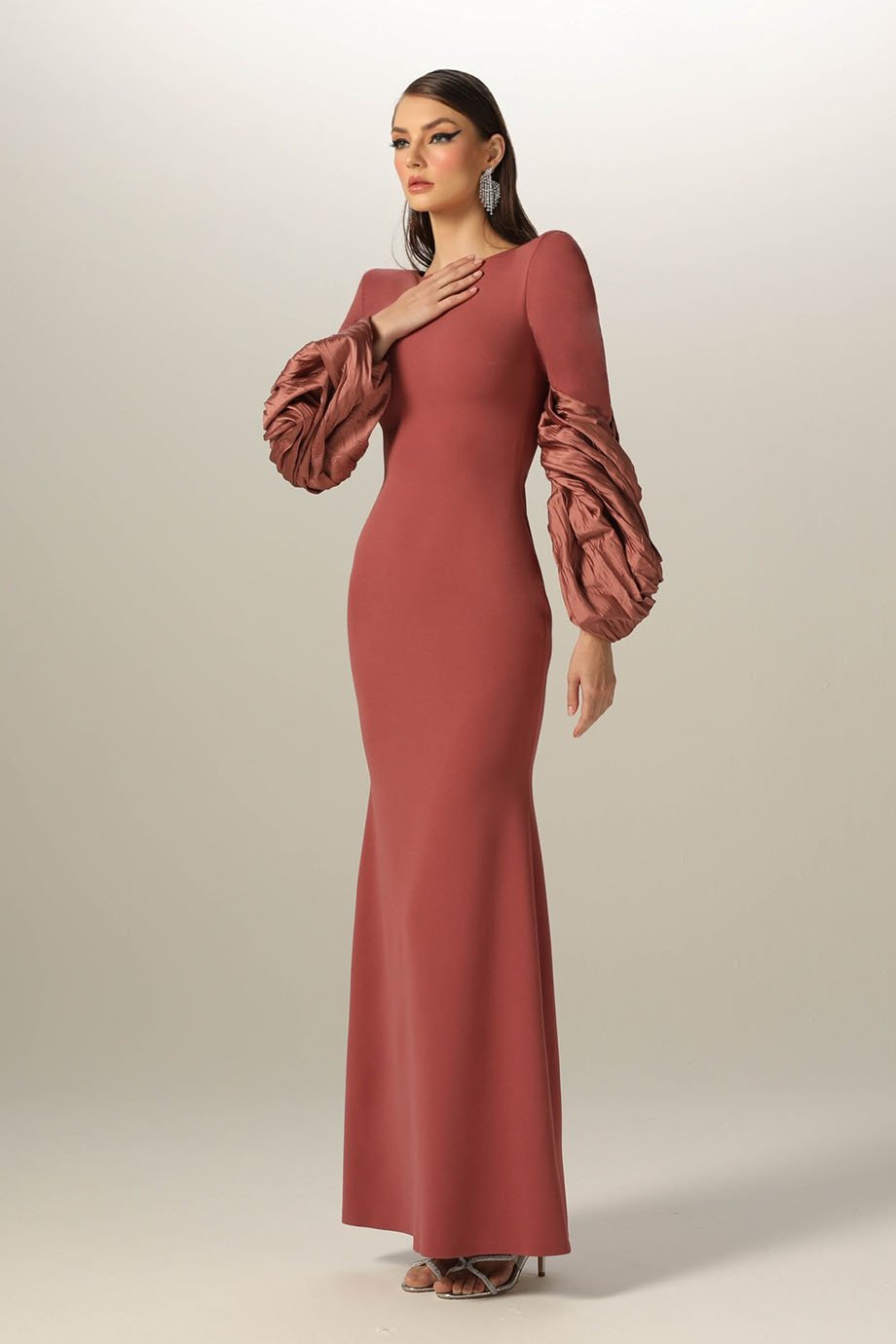 Evening length lycra crepe mermaid dress with a boat neckline and hand – manipulated taffeta sleeves.