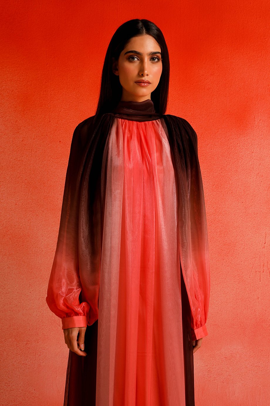 Shimmer printed chiffon fabric kaftan with slit semi-bishop sleeves.