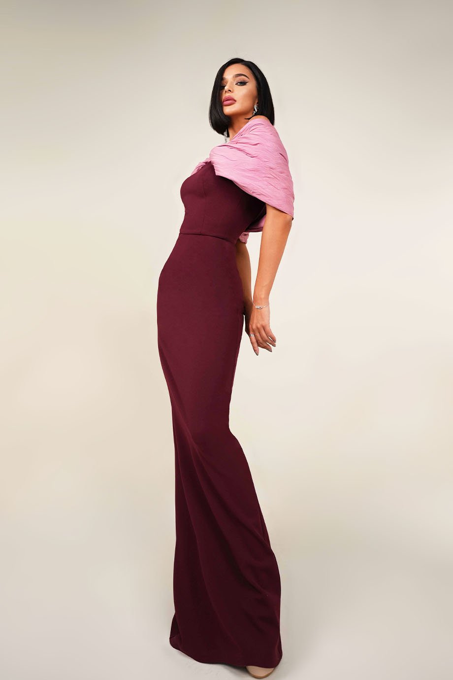 Lycra crepe pencil dress, evening length, boat neckline, asymmetric hand pleated taffeta shoulder