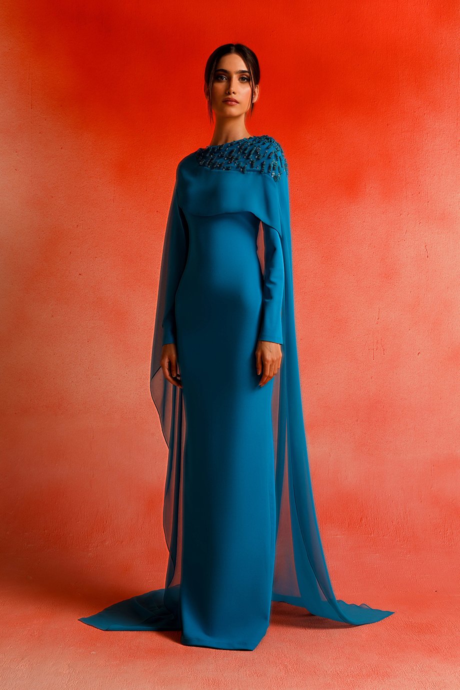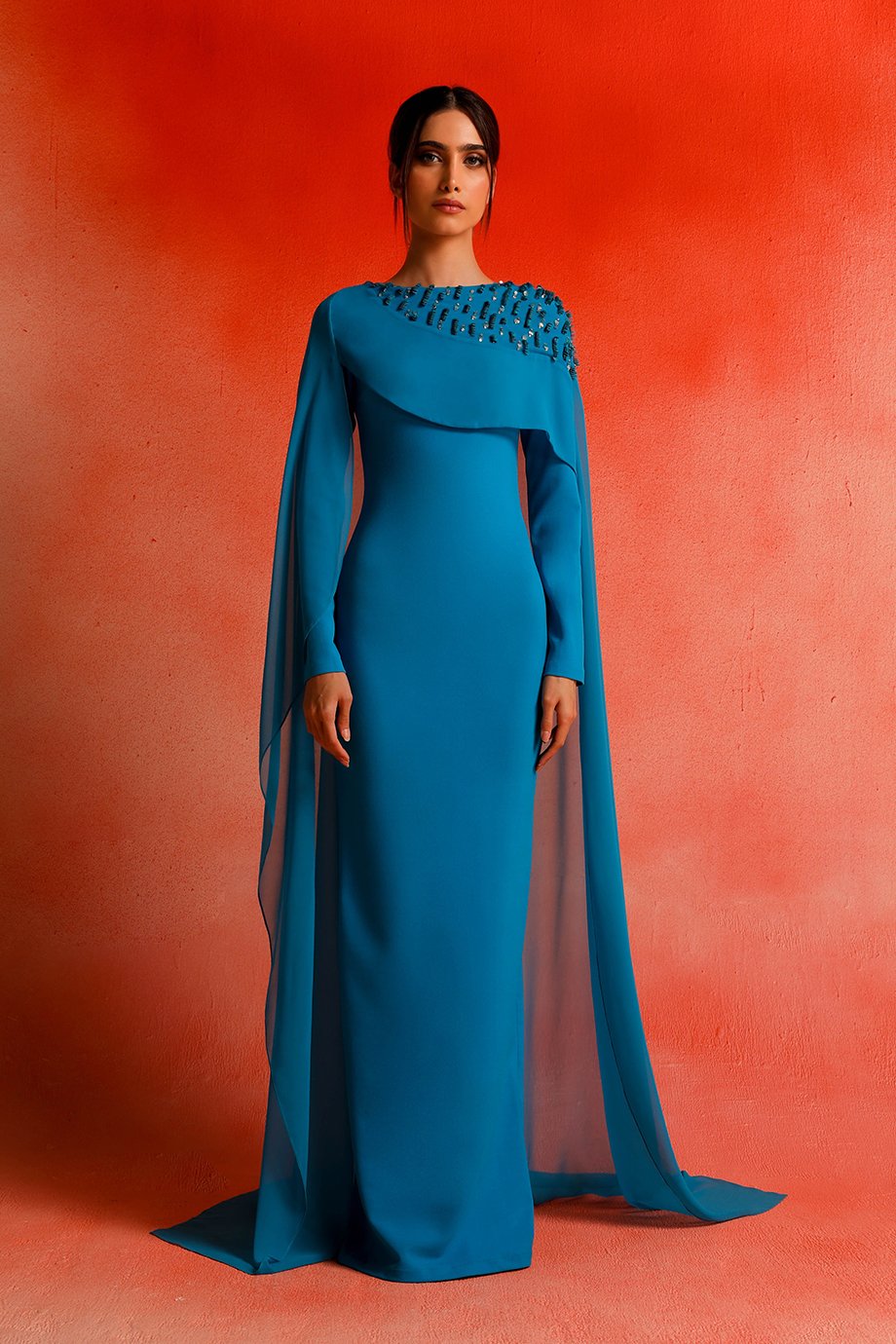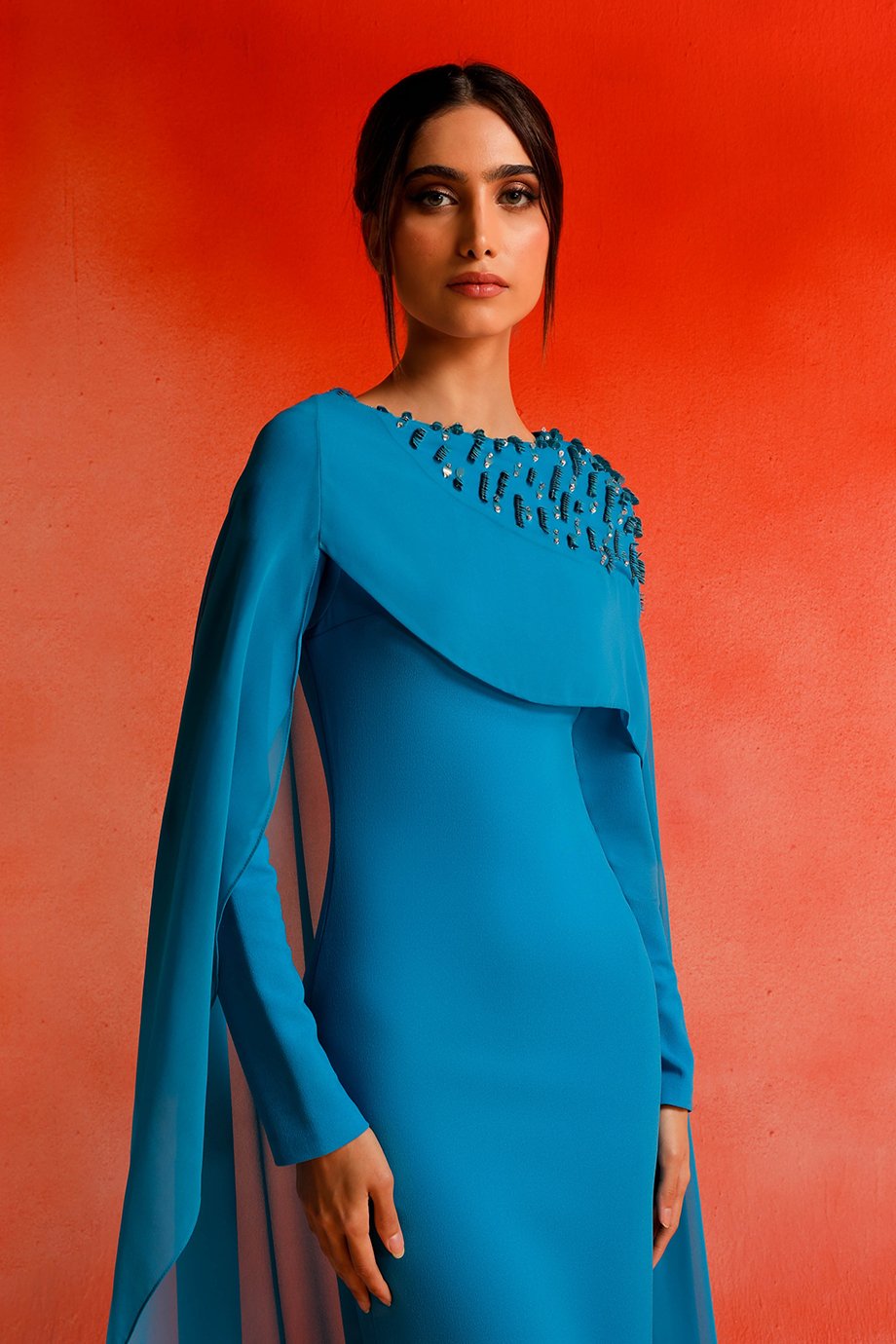 Asymmetric chiffon cape paired with a lycra crepe dress adorned with blue shaded hand embroidery
