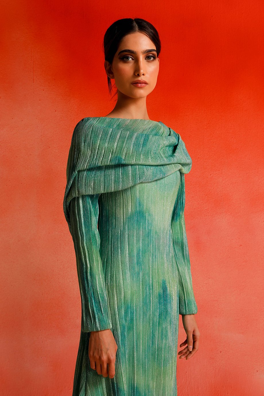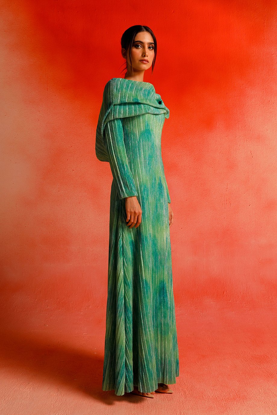 Unique customized printed shimmery jersey fabric kaftan with an asymmetric hand drape.