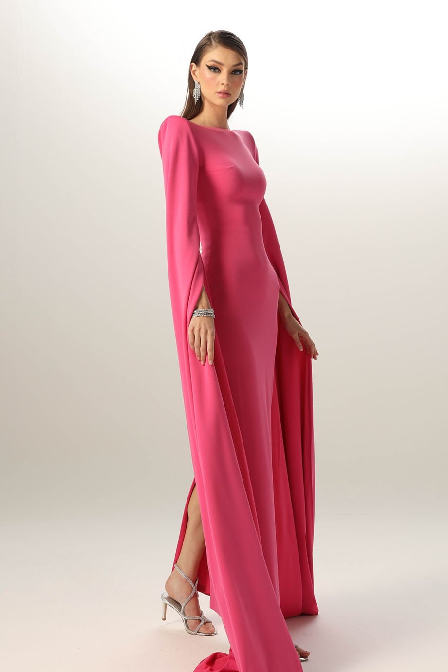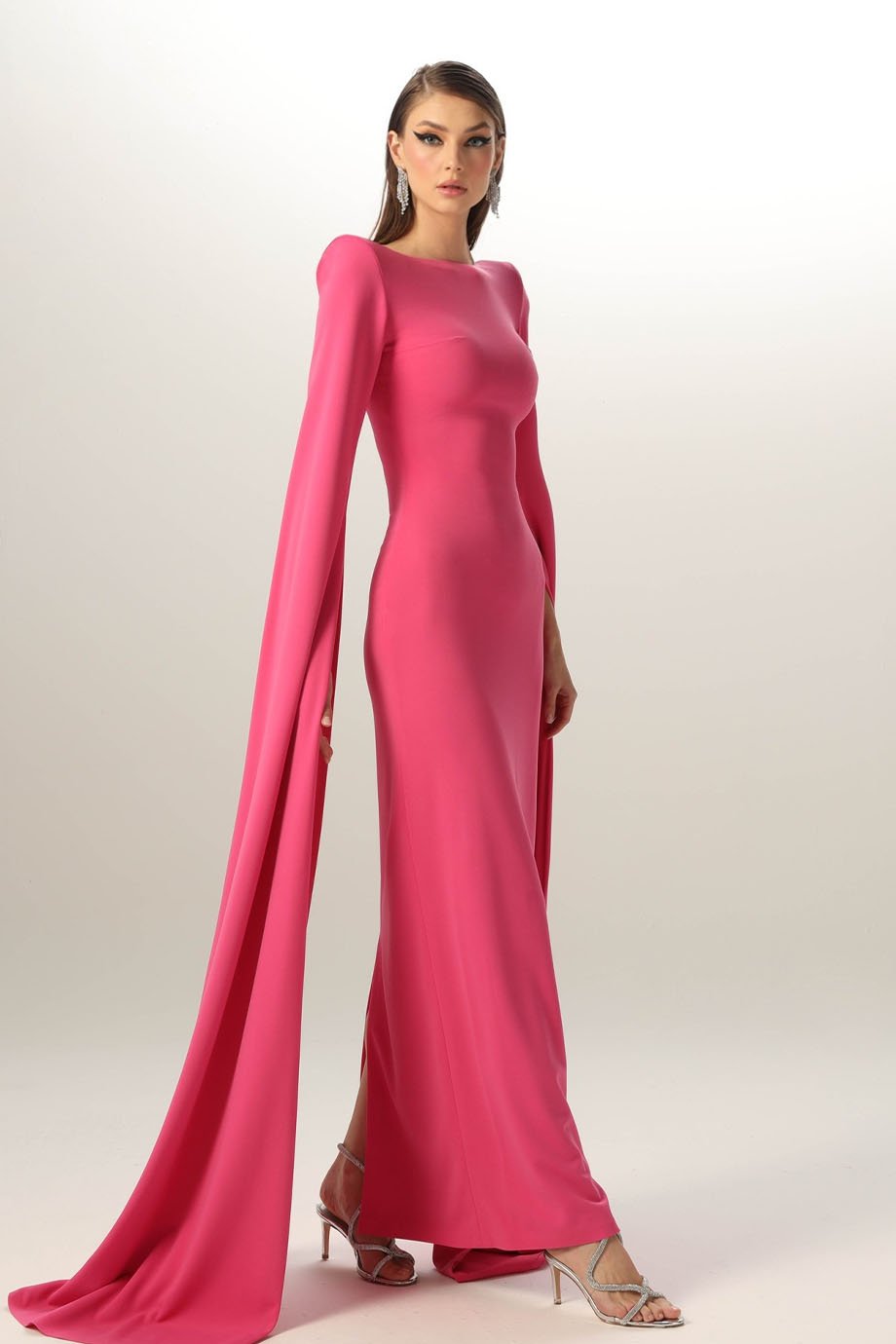 Lycra crepe pencil dress, evening length, boat neckline, long floor length sleeves