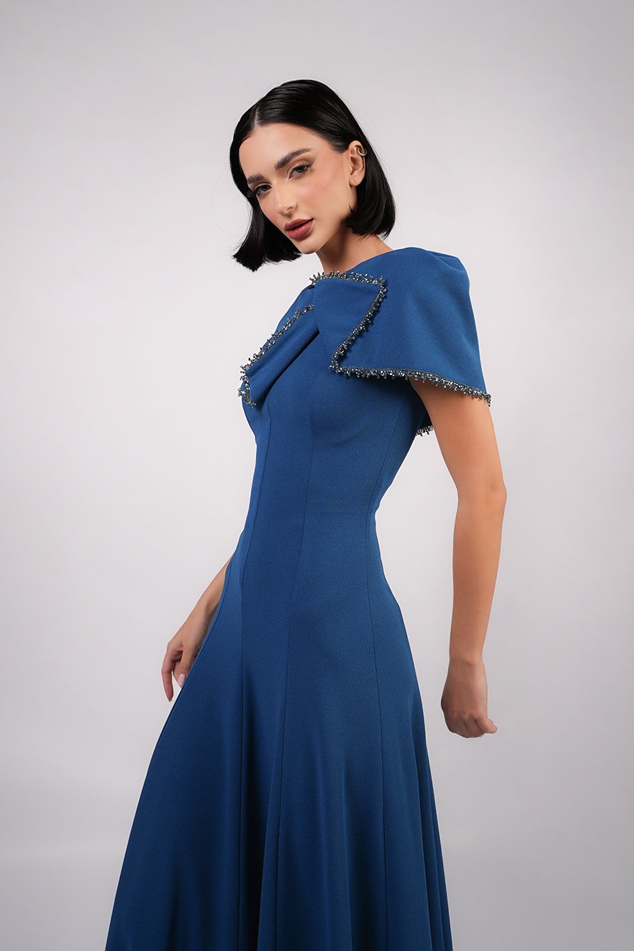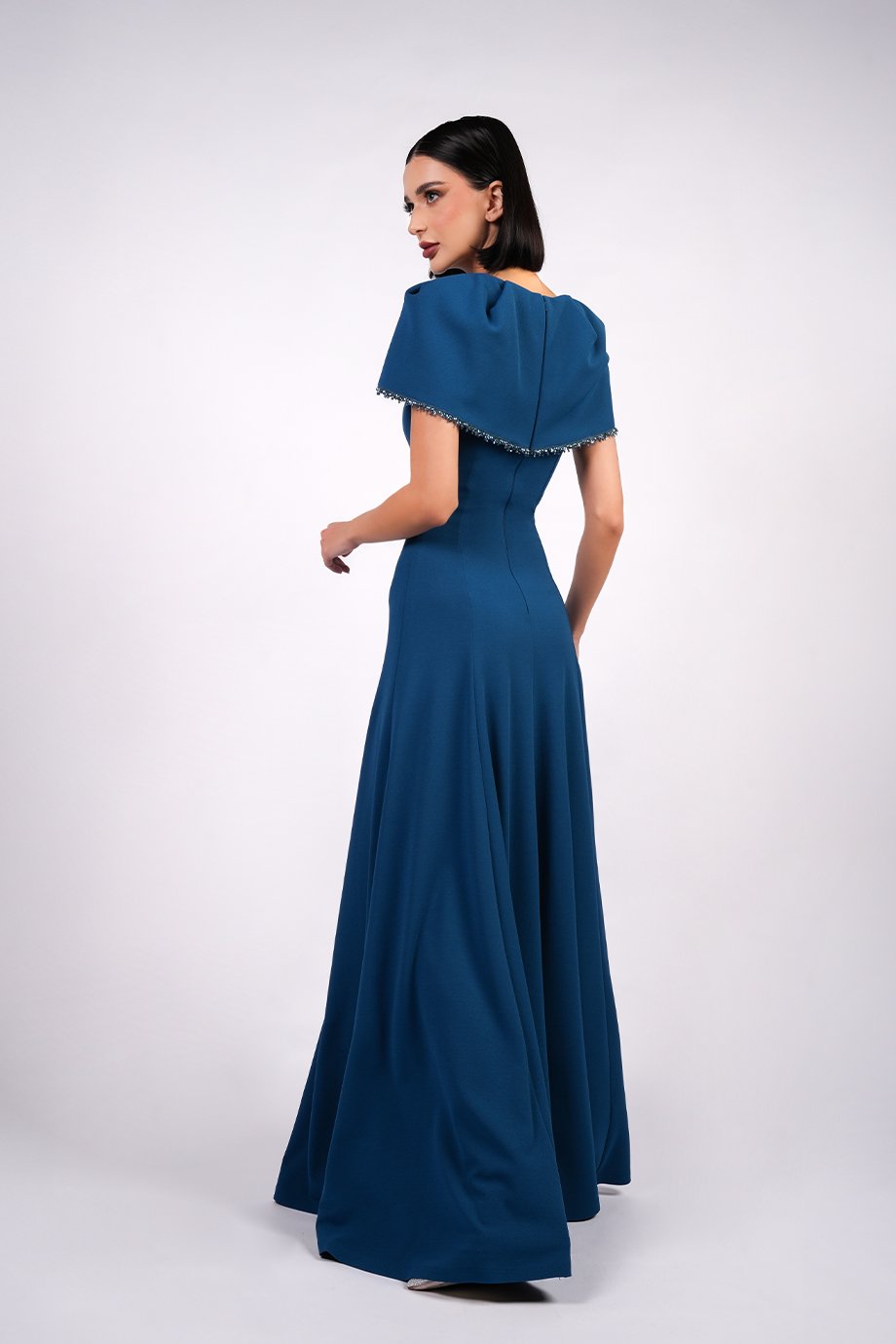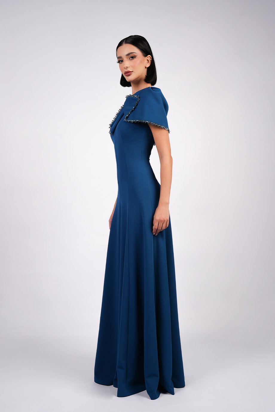 This floor-length lycra crepe dress features an asymmetrical cape-style neckline. The capelet is finished with delicate handmade embellishments.