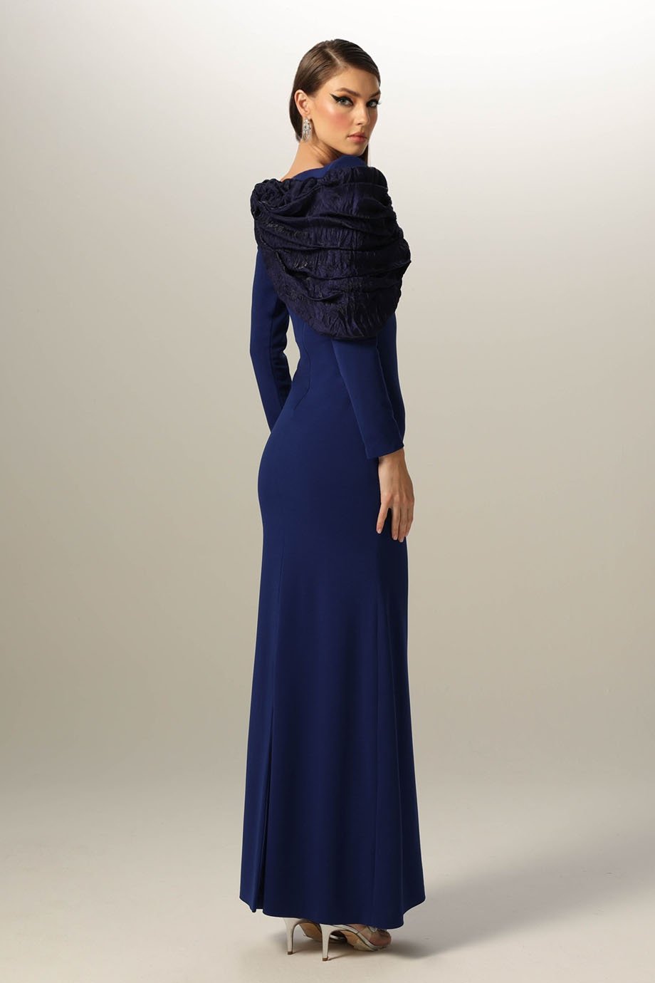 Lycra crepe mermaid dress, evening length, boat neckline, asymmetric hand manipulated shoulder