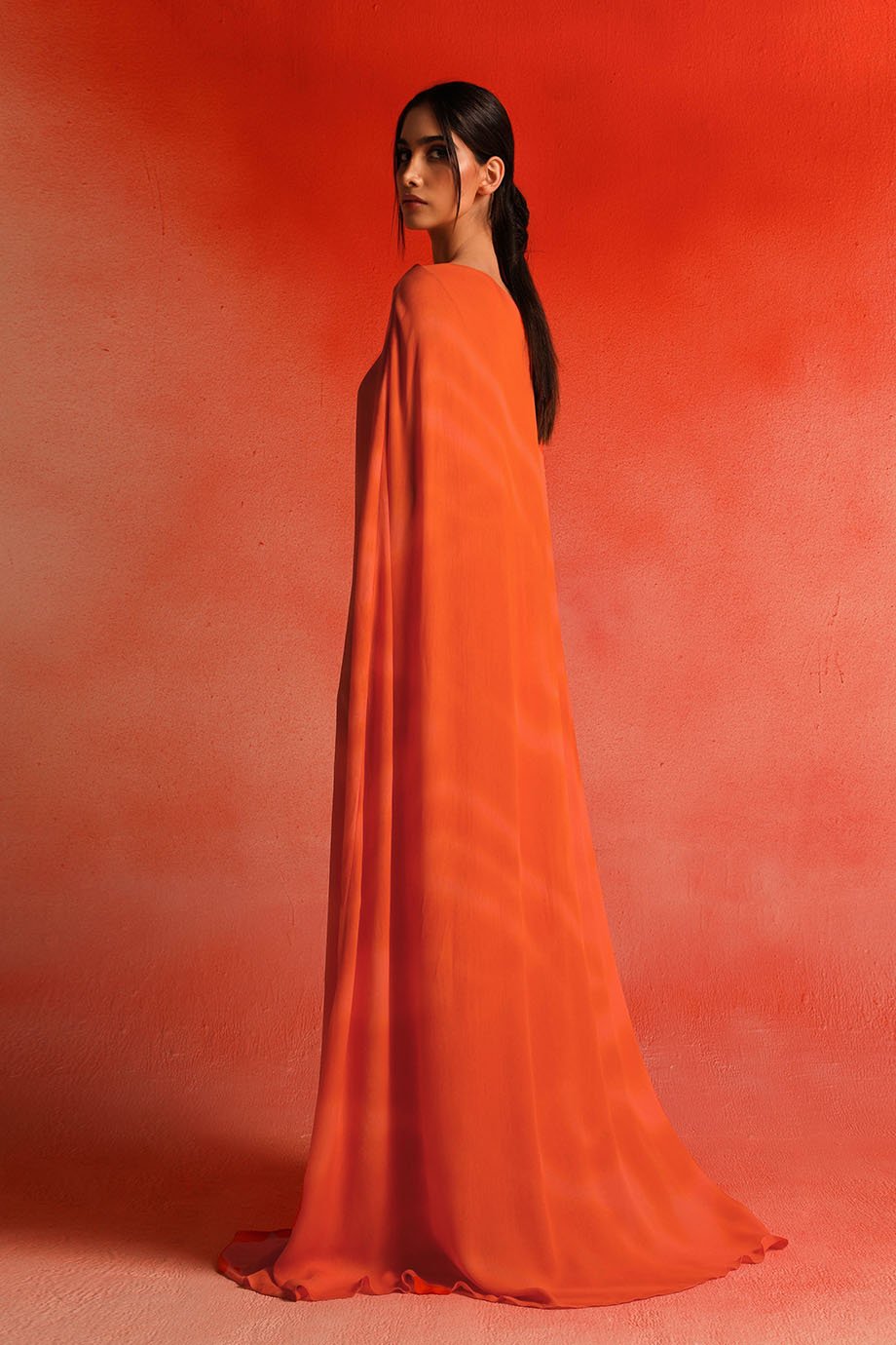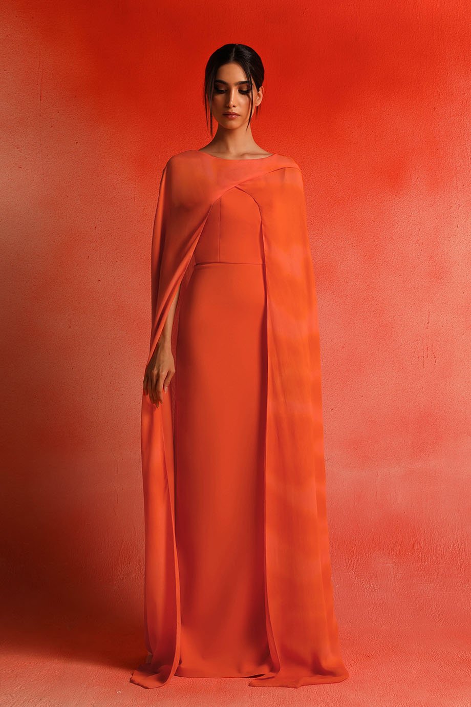 Unique customized printed chiffon cape with a lycra crepe dress.