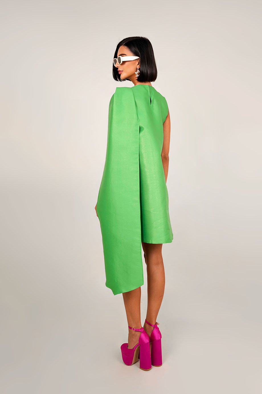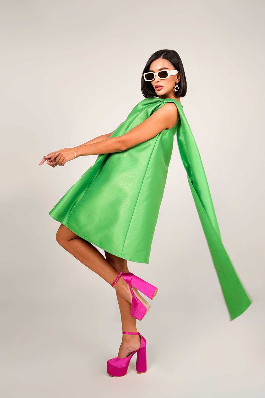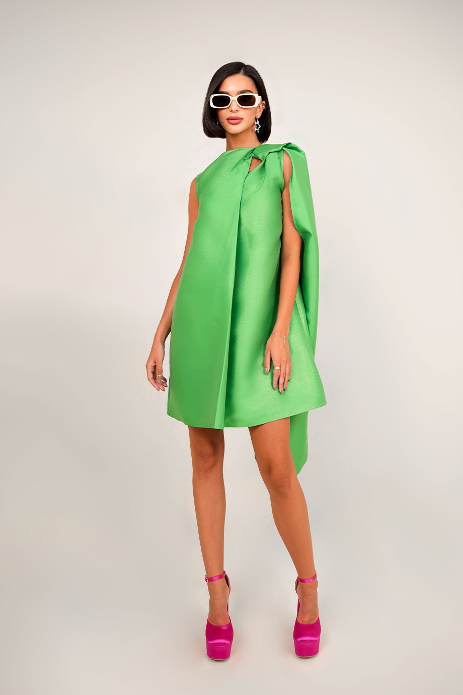This loose-fitting mini dress in luxurious Mikado fabric features a bold one-shoulder design with an oversized knot detail for standout style.