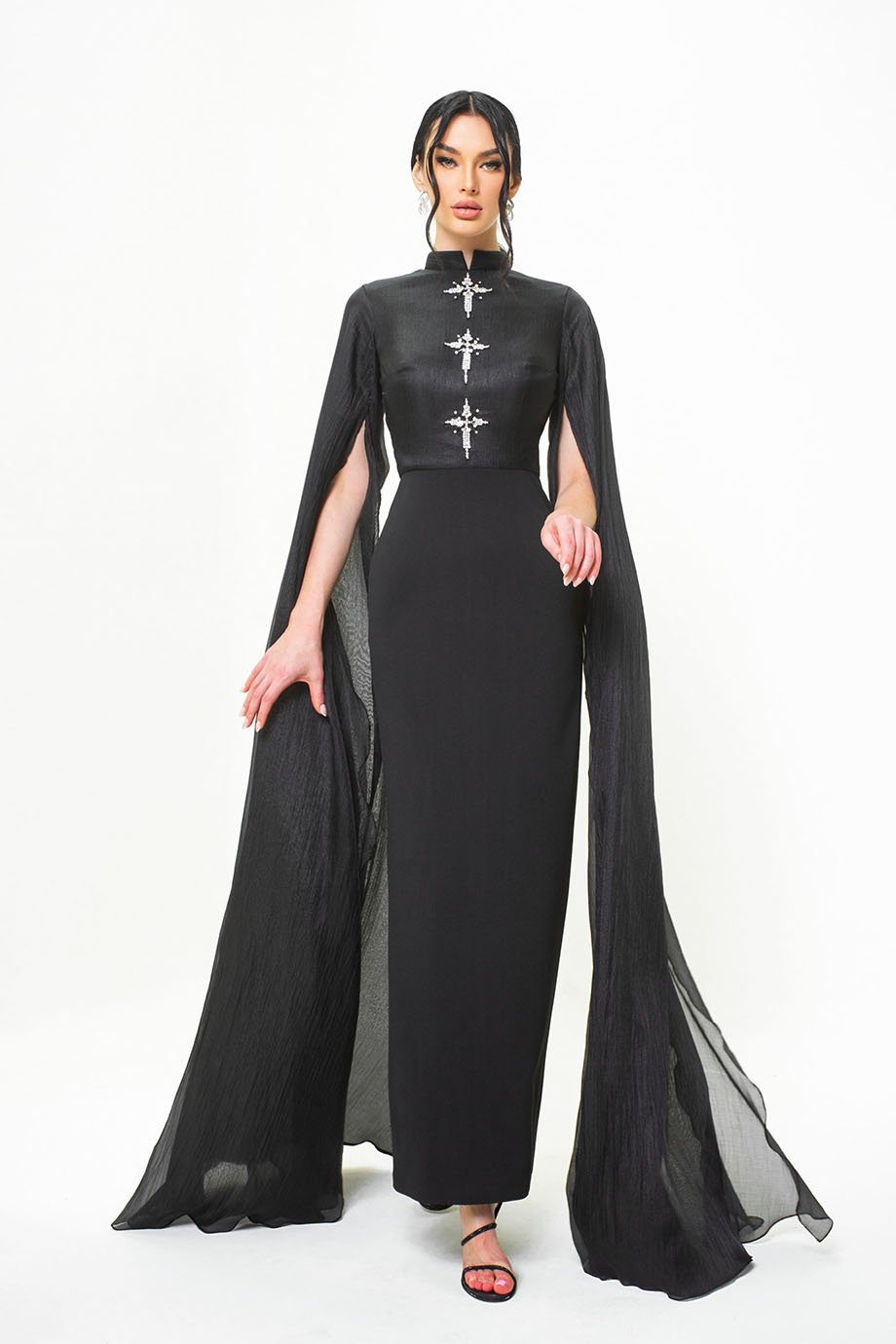 Cape sleeves kaftan in tissue organza top and light neo – crepe dress with 3 stars embroidery
