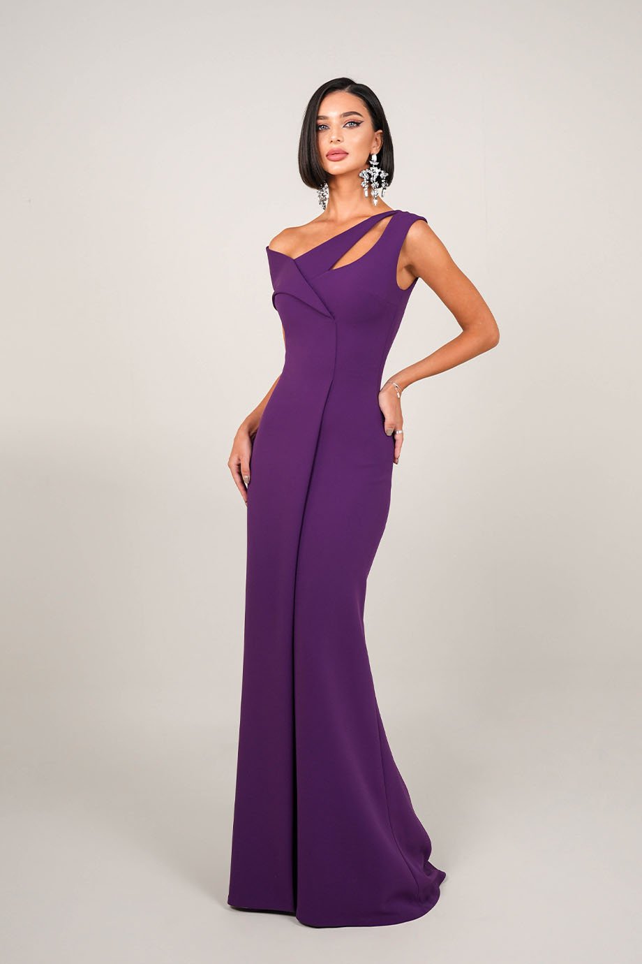 A floor-length mermaid dress in lycra crepe features a unique asymmetrical neckline and a striking diagonal cutout across the chest.