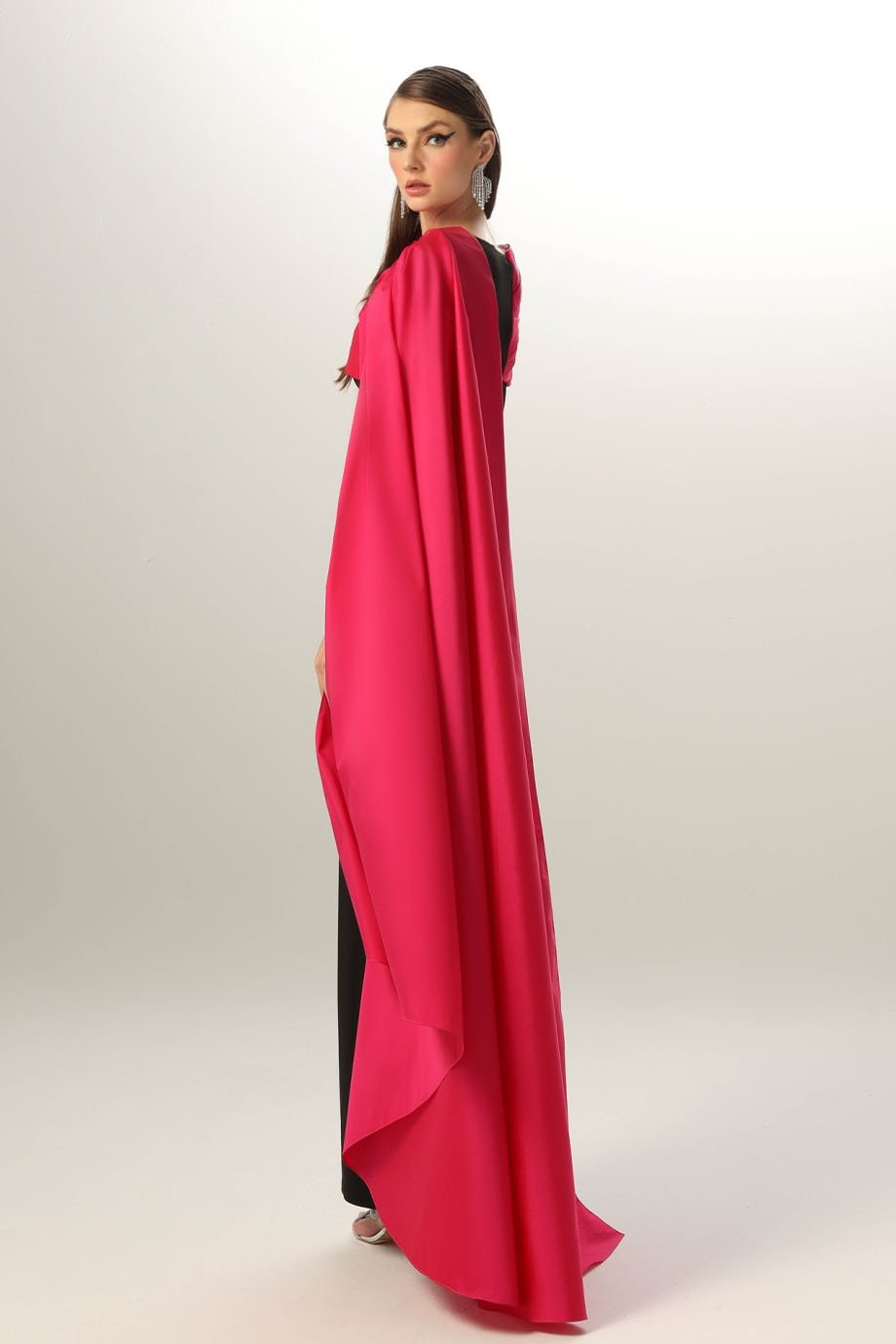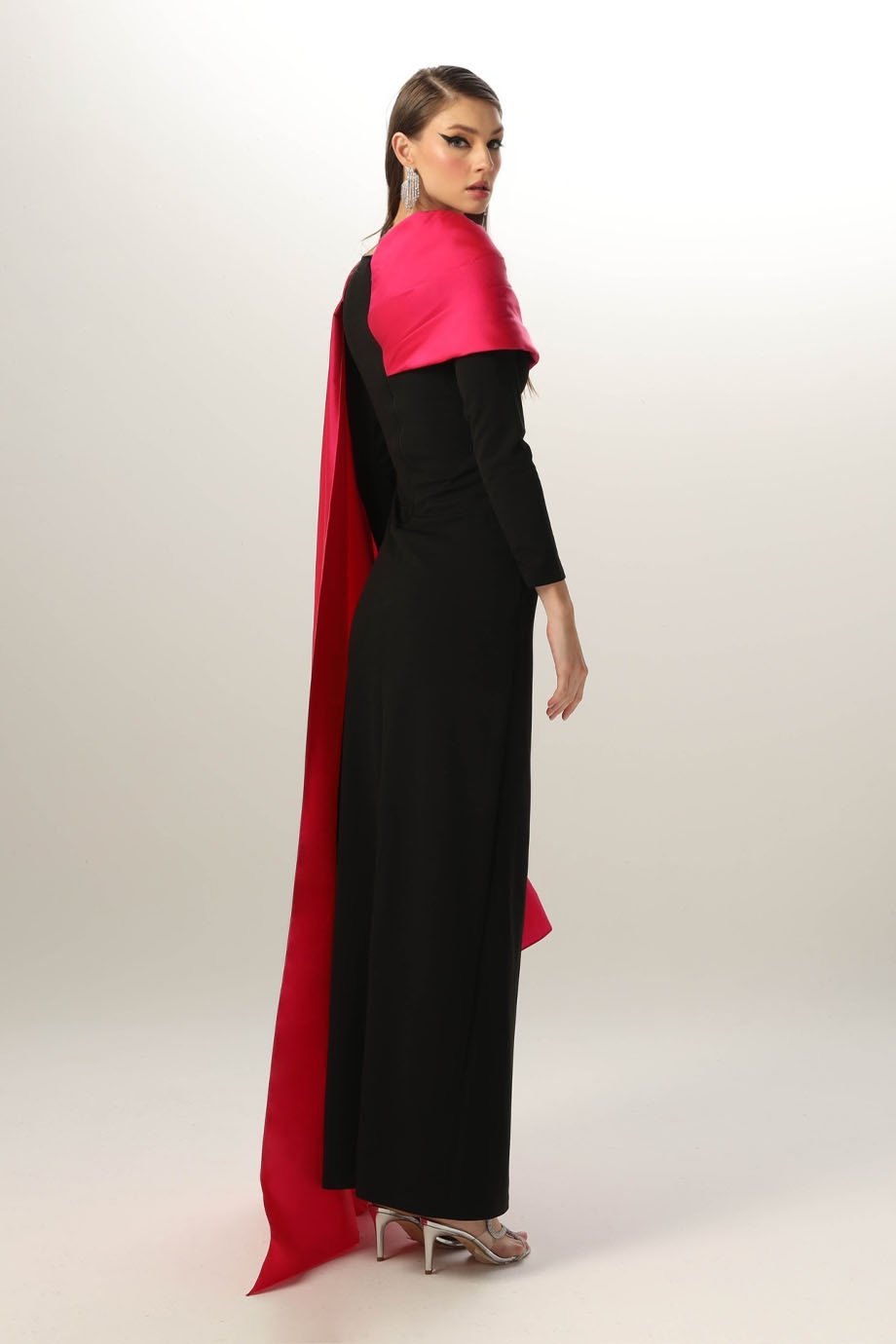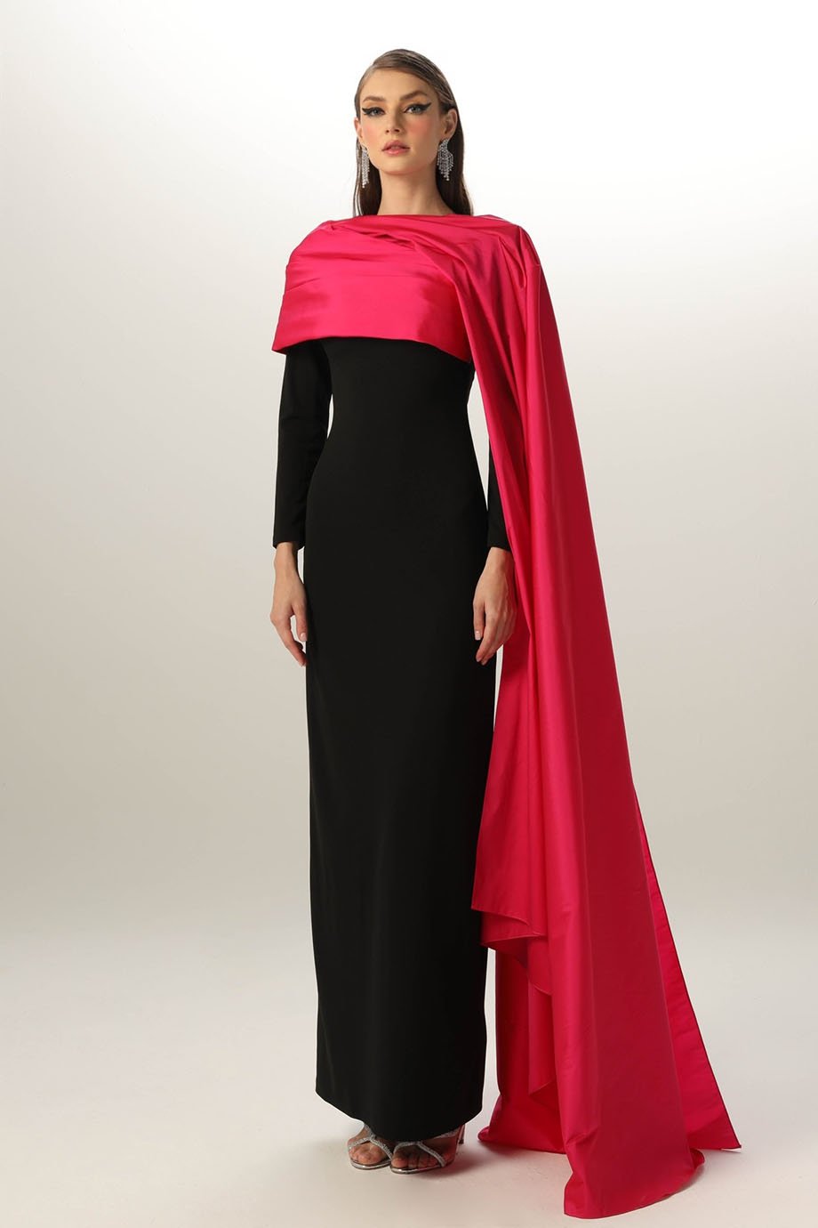 Lycra crepe pencil dress, evening length, asymmetric hand pleated taffeta shoulder with one side long shawl.