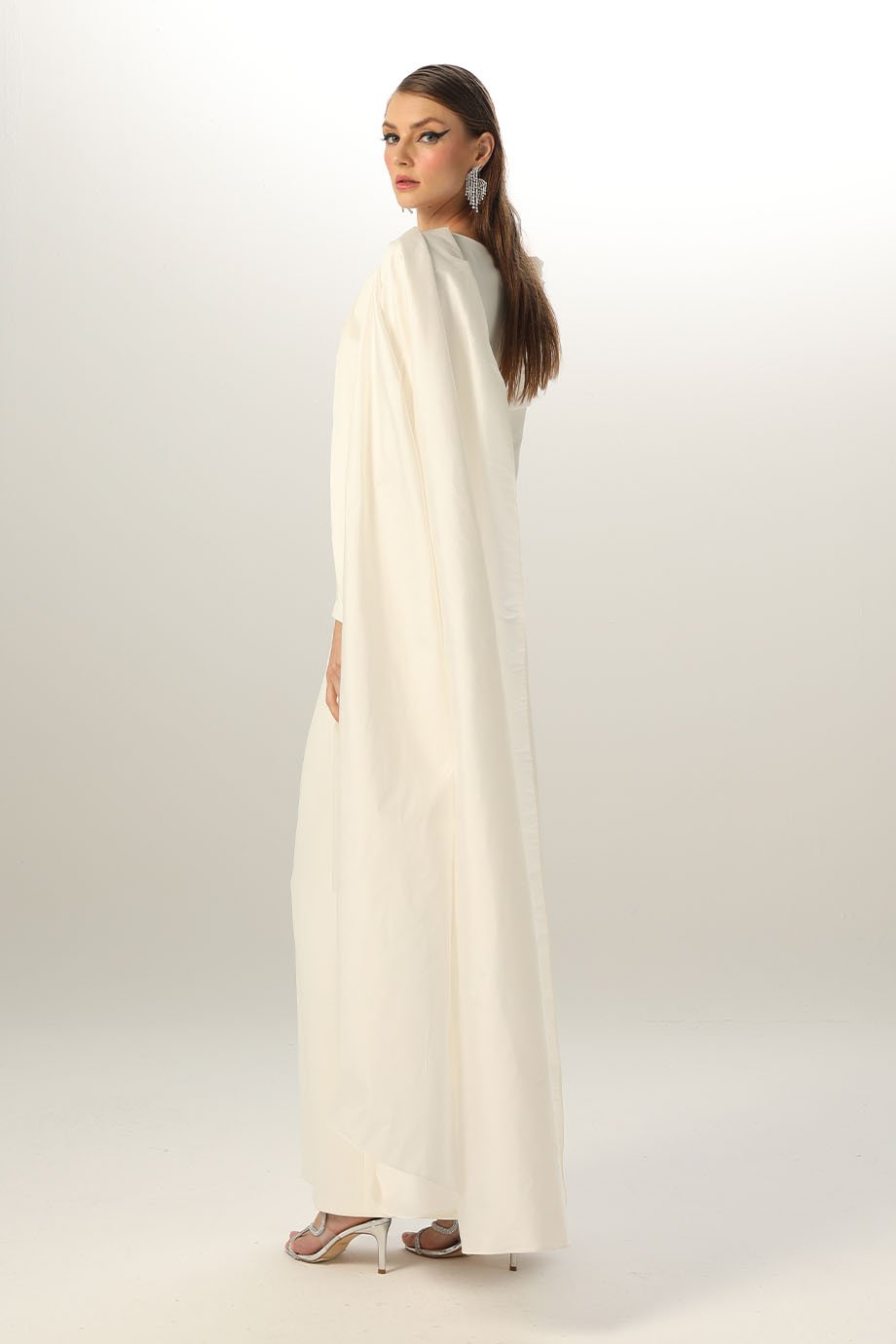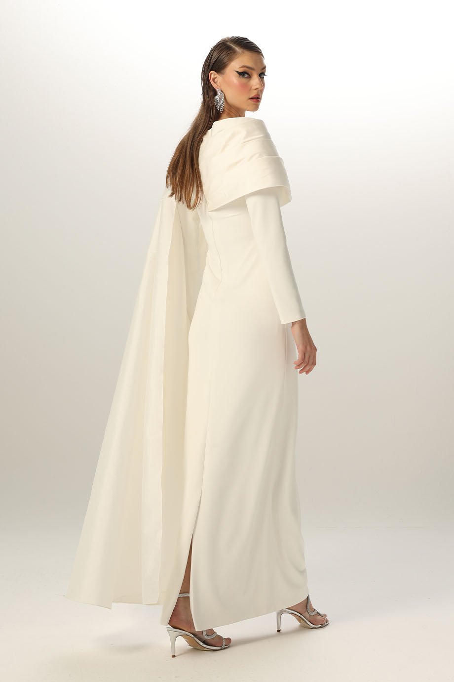 Lycra crepe pencil dress, evening length, asymmetric hand pleated taffeta shoulder with one side long shawl.