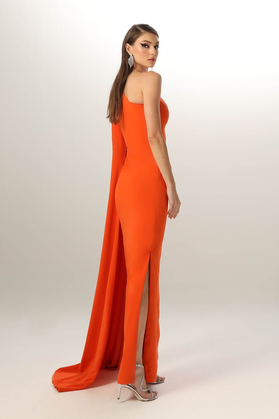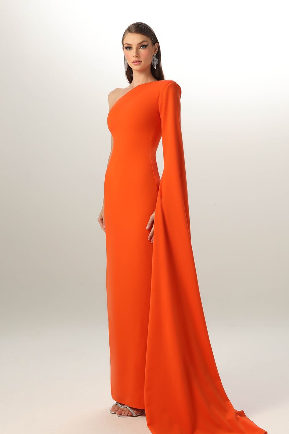Lycra crepe pencil dress, evening length, one shoulder, floor length sleeve.