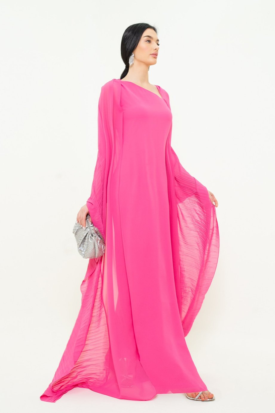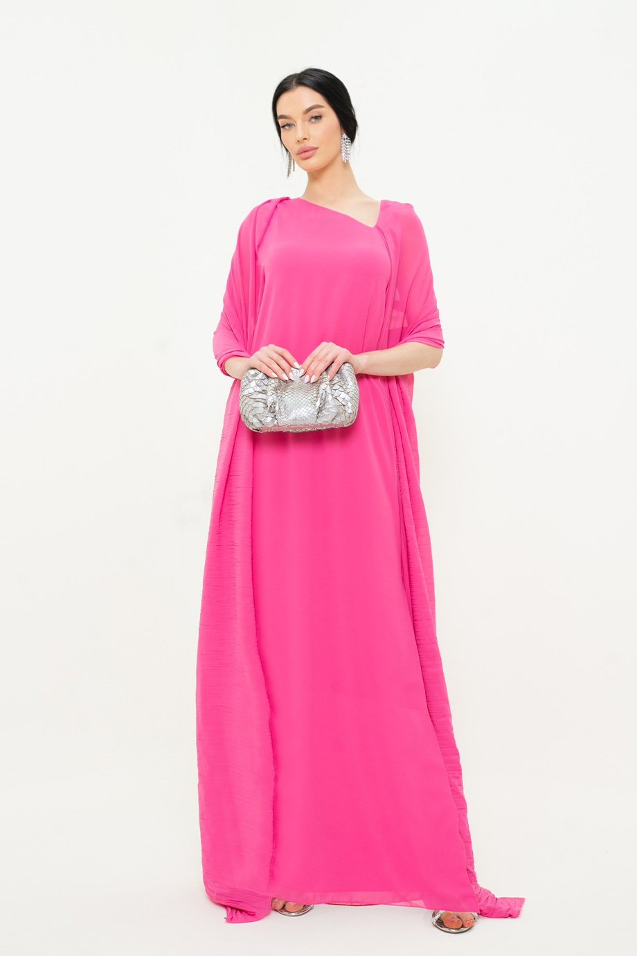 Asymmetric cut kaftan in chiffon fabric with attached shawl.