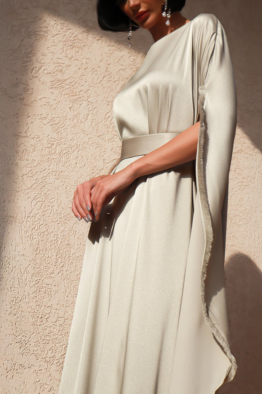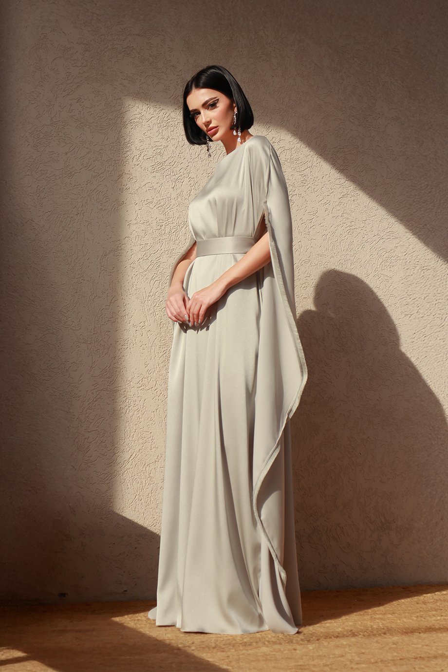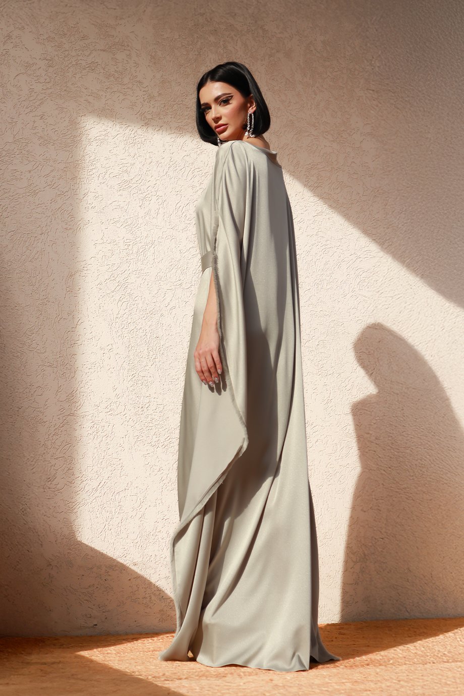 Free-size silky crepe kaftan with a non-attached belt, adorned with handcrafted thread details along the sides.