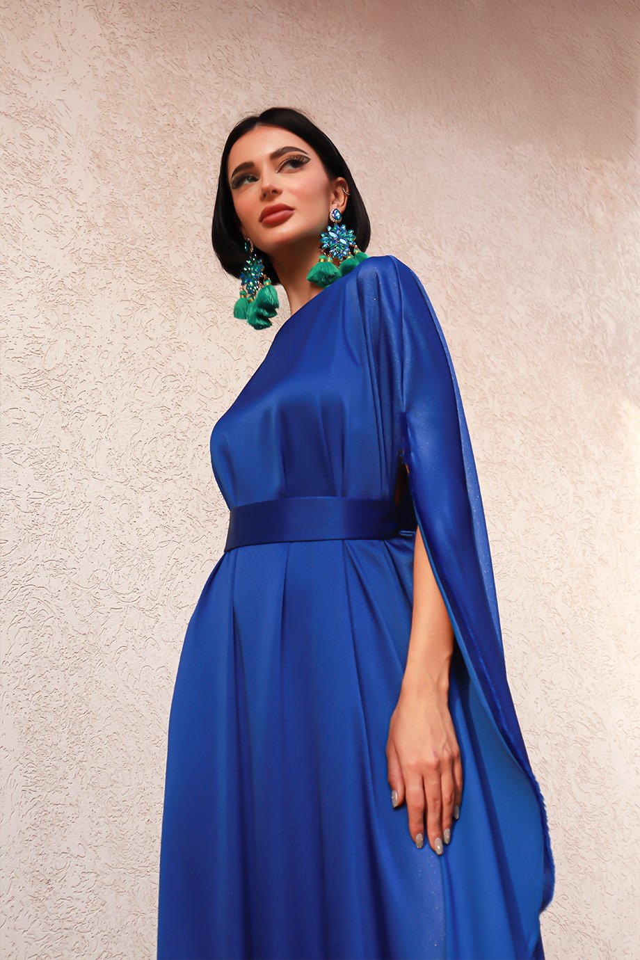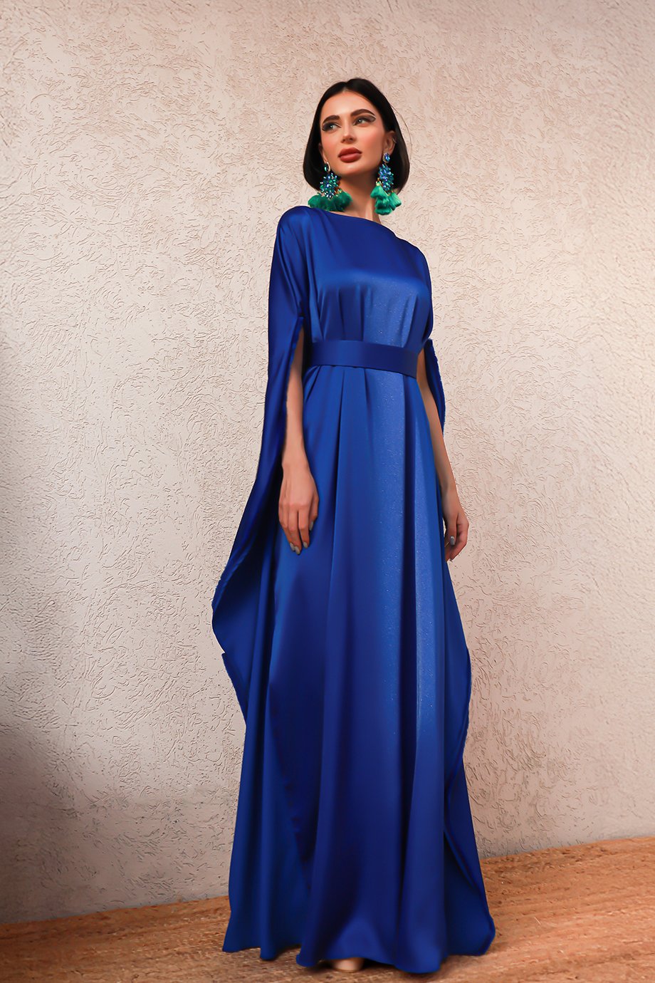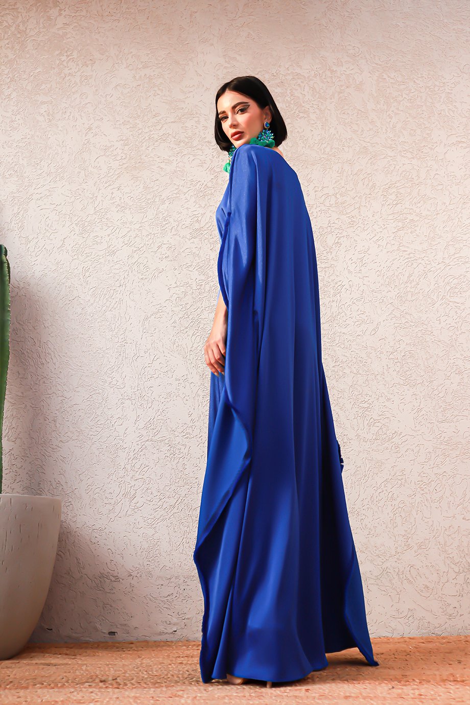Free-size silky crepe kaftan with a non-attached belt, adorned with handcrafted thread details along the sides.