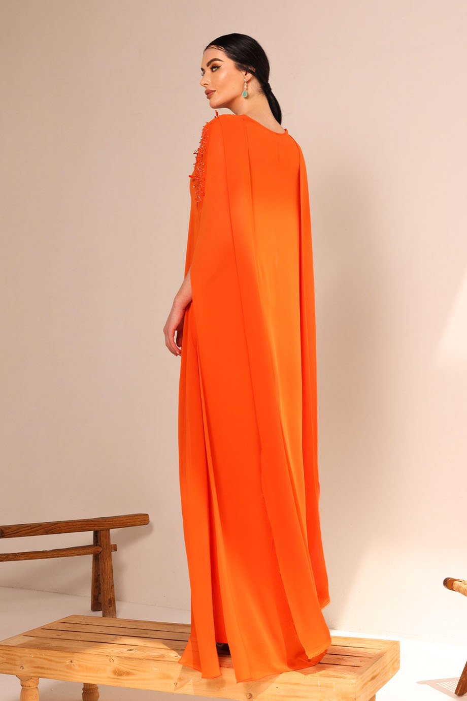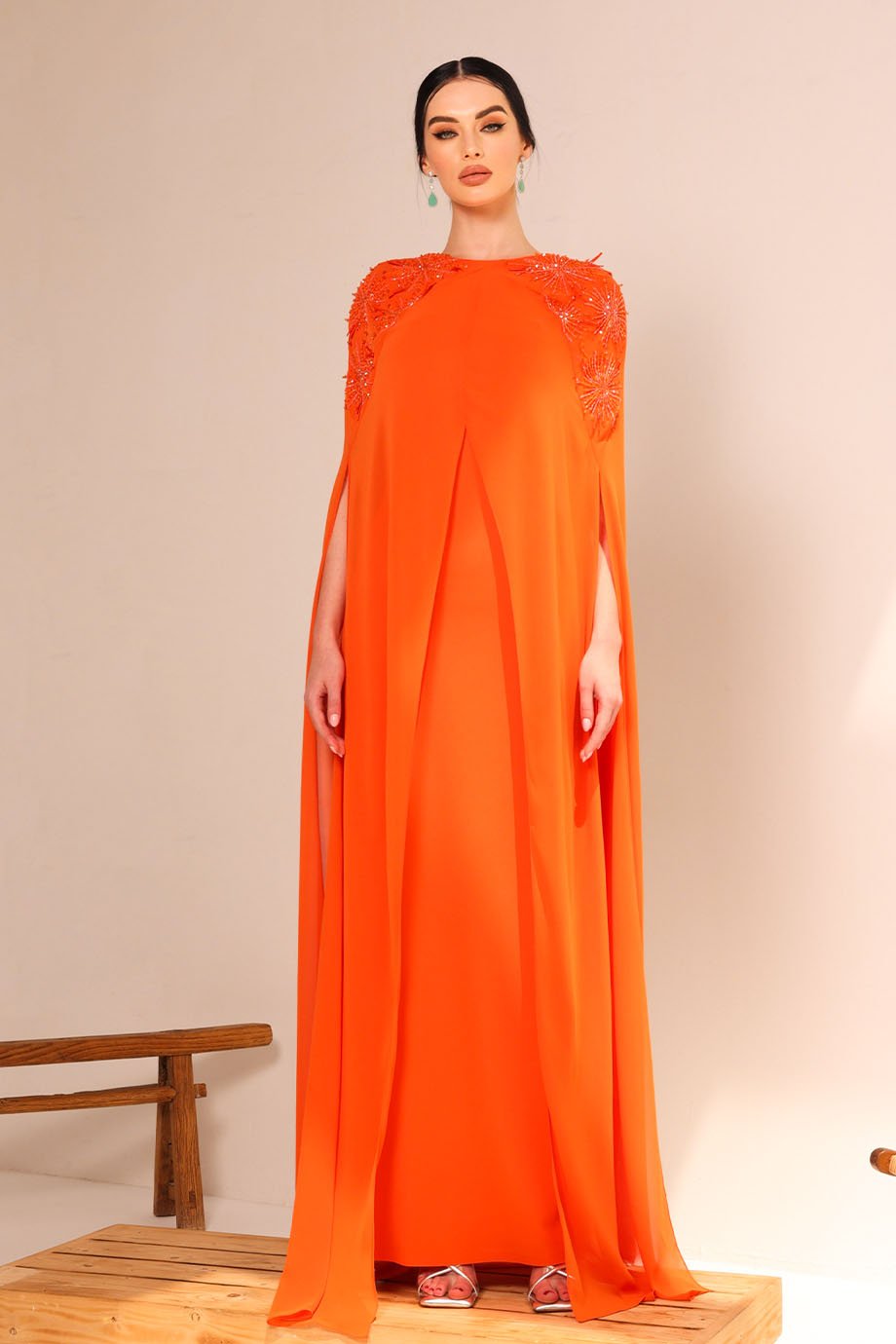 Open slit kaftan in chiffon fabric with fireworks embroidery details in glass beads.