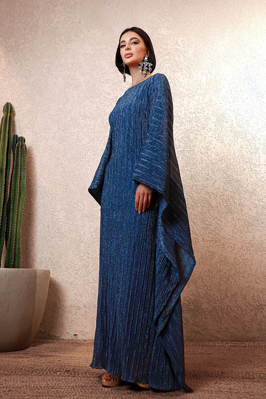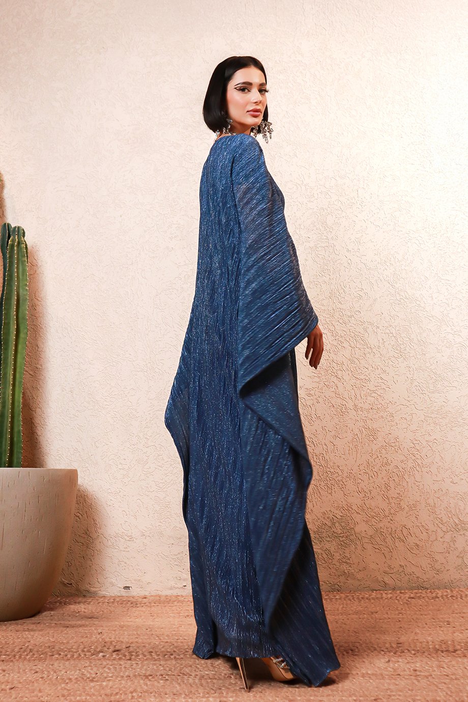 Shimmer pleated metallic free-size kaftan with a hidden belt, a fluid flowing cut, and an inner layer.